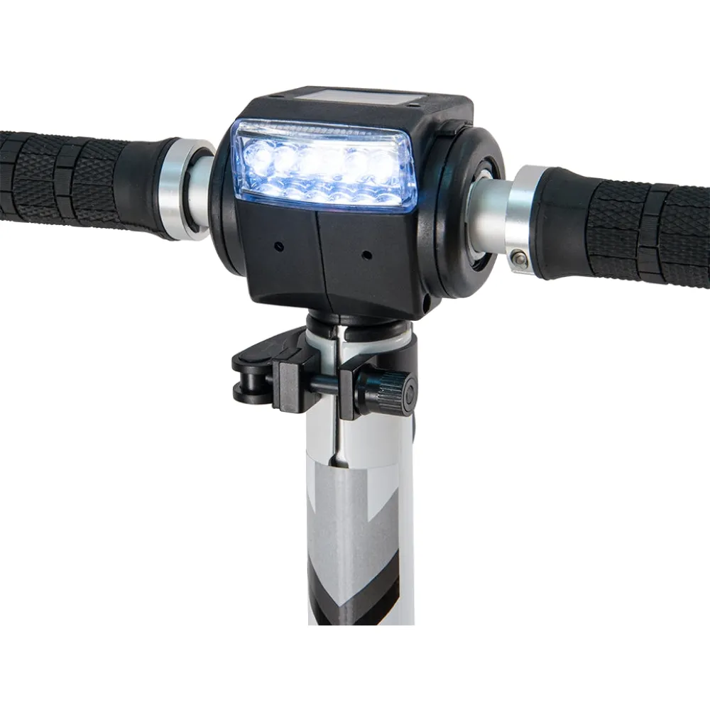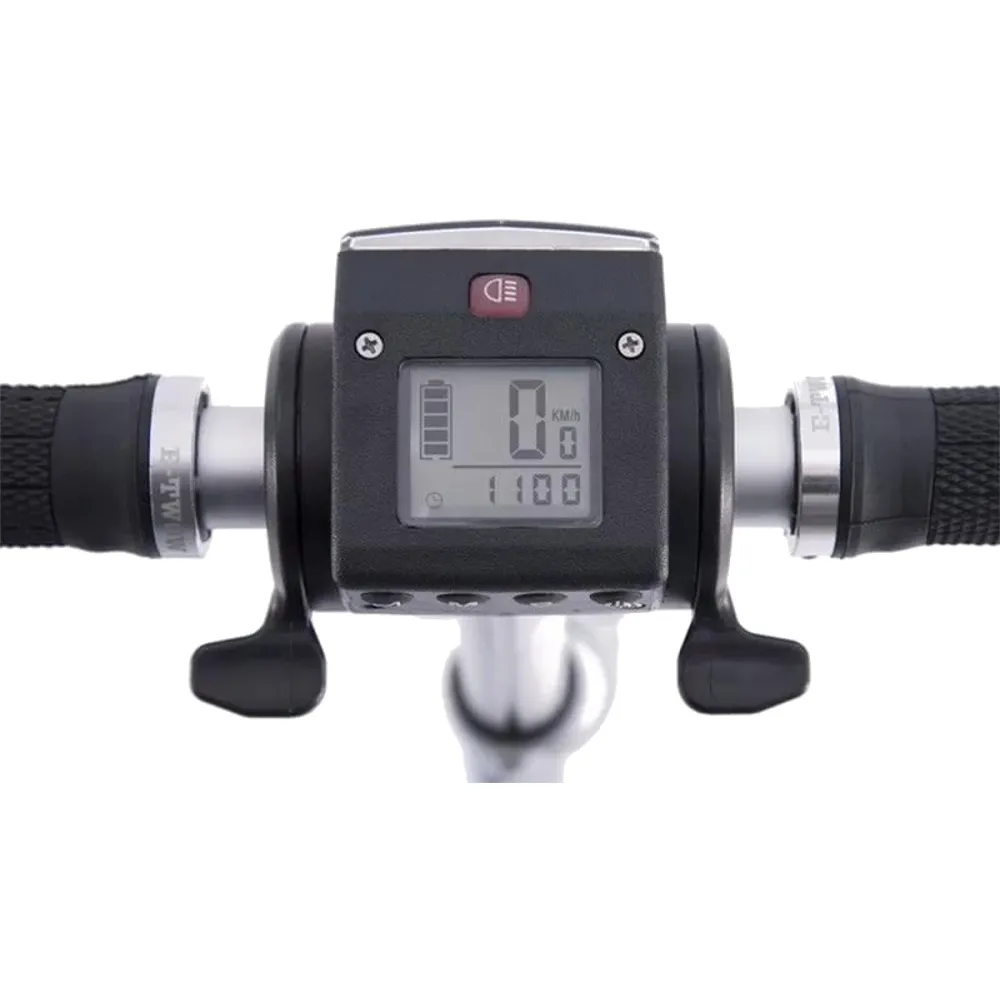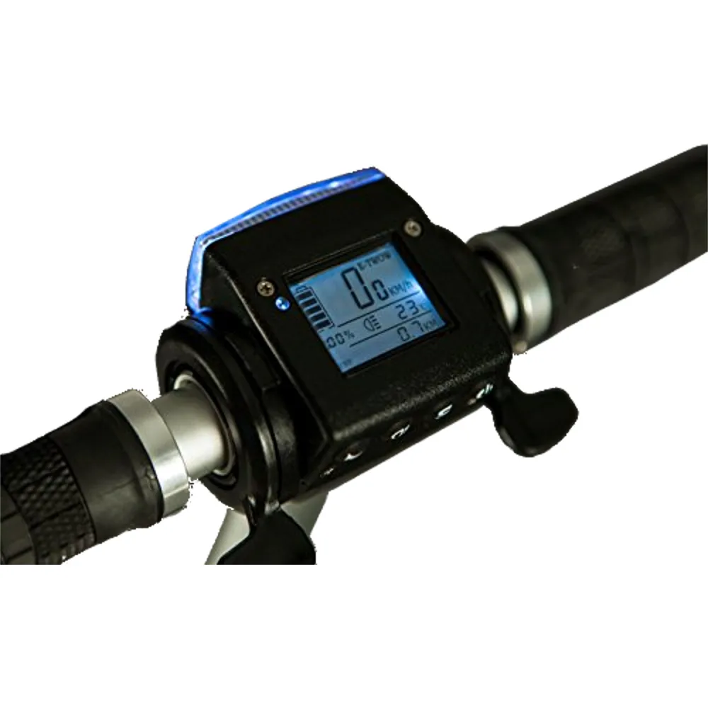 Электросамокат Generic E-twow S2 BOOSTER на рулевой стойке имеет светодиодную фару, информационный дисплей, на котором отражается скорость, заряд батареи, длительность хода.