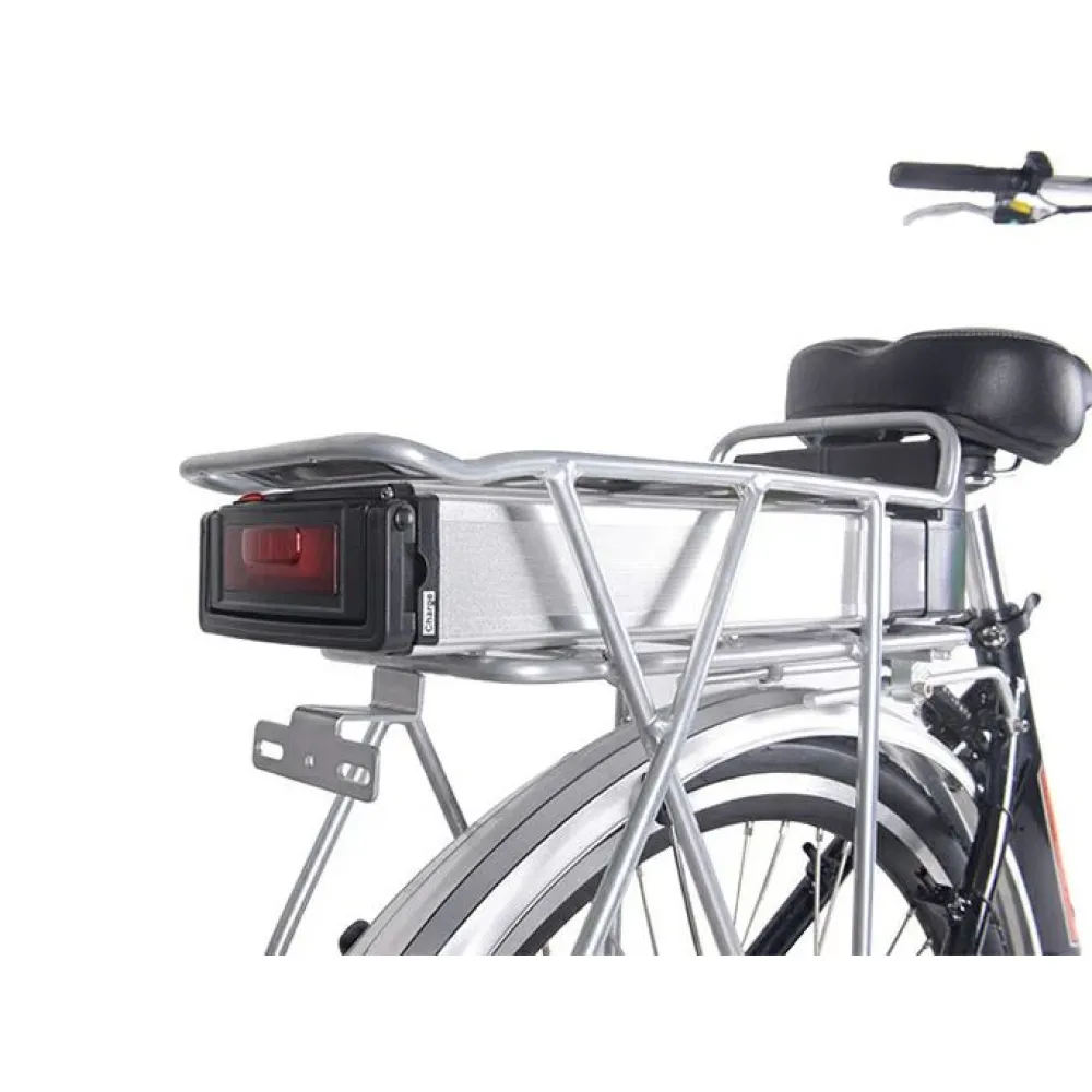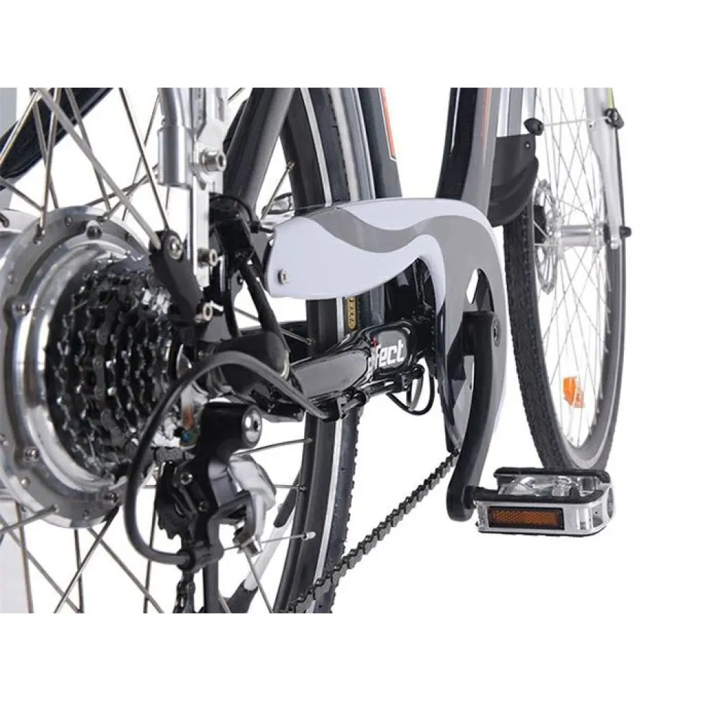 Электродвижок 350 Вт с задним приводом цепного типа разгоняет технику до 35 км/час. Батарея размещена на багажнике для экономии пространства и позволяет пройти до 30 км пути без подзарядки. Спортивное сидение имеет специальную систему регулировки. Электровелосипед имеет 28 дюймовые колеса для отличного наката. Заказать модель быстро позволит телефонный звонок менеджеру или сообщение в онлайн-чате.